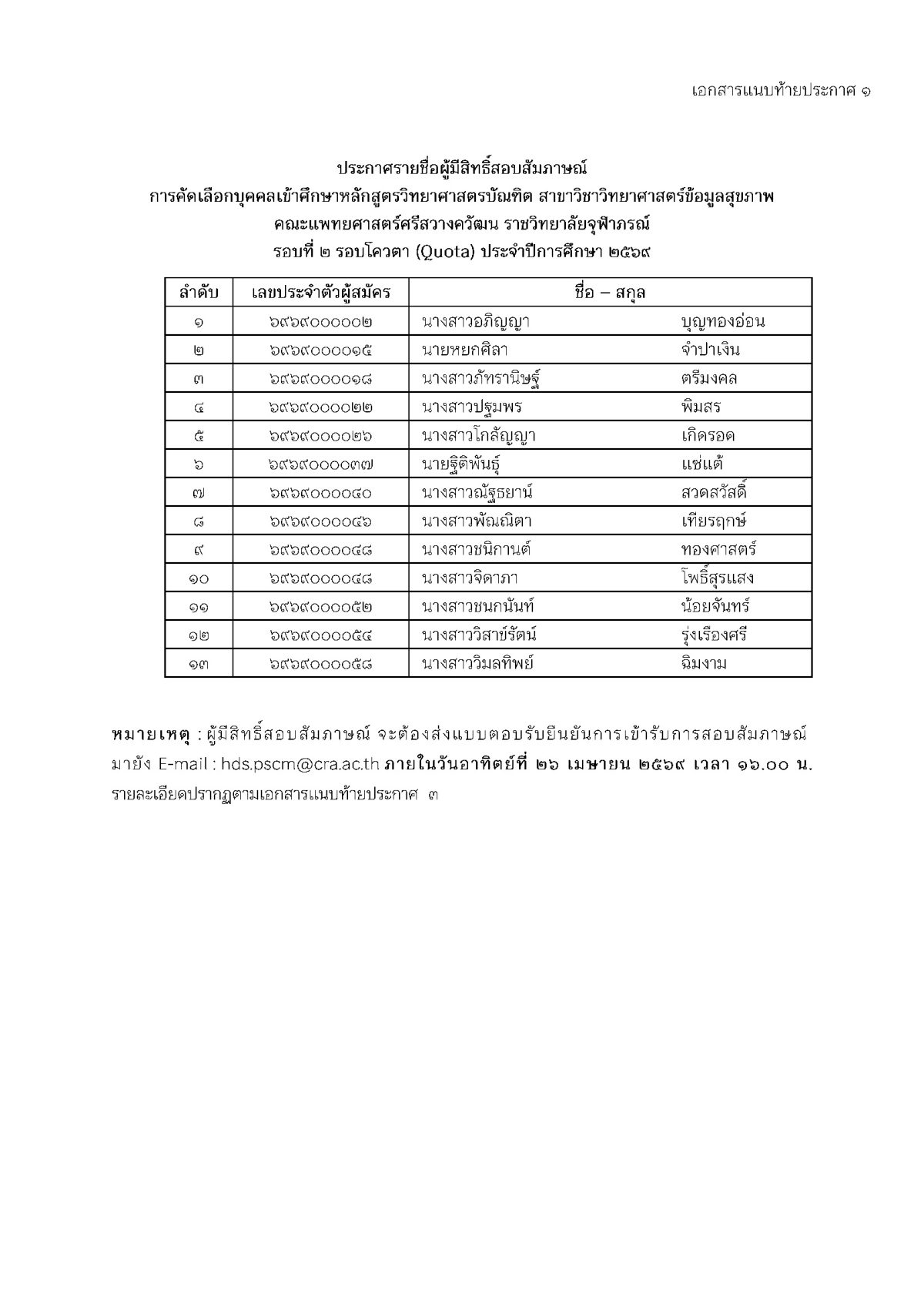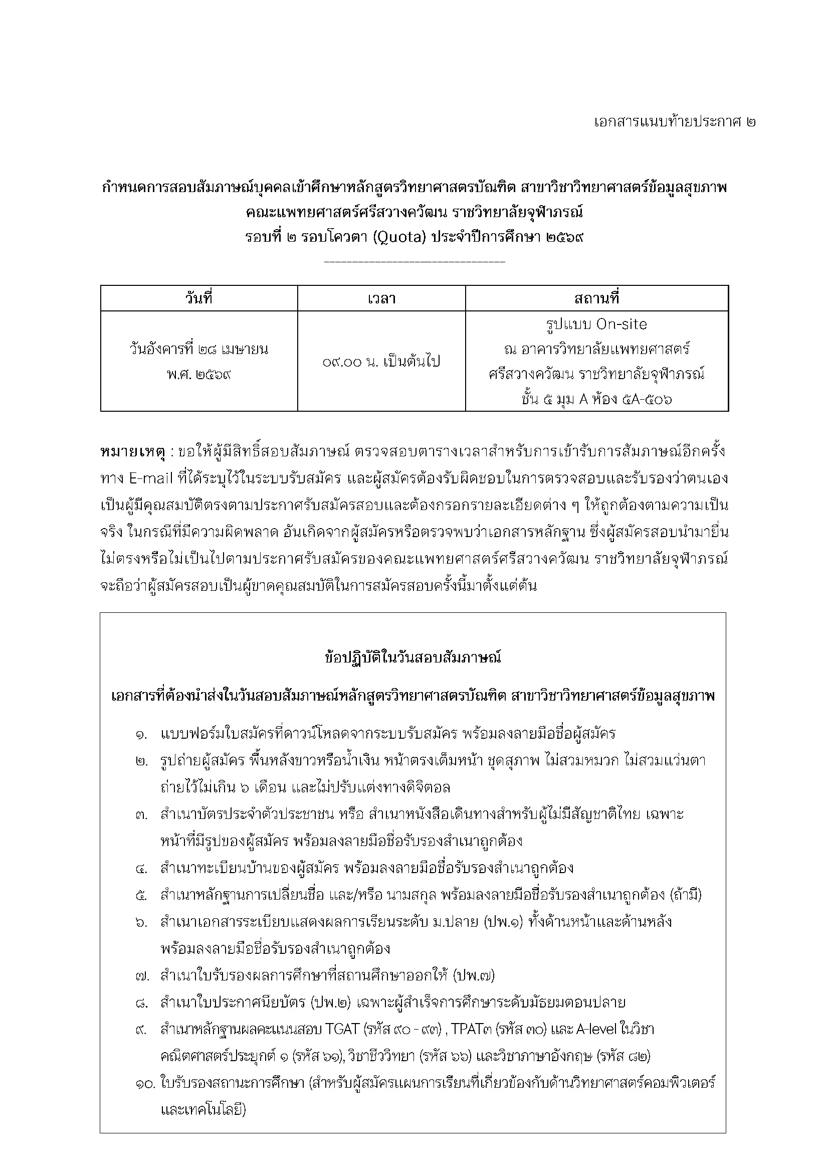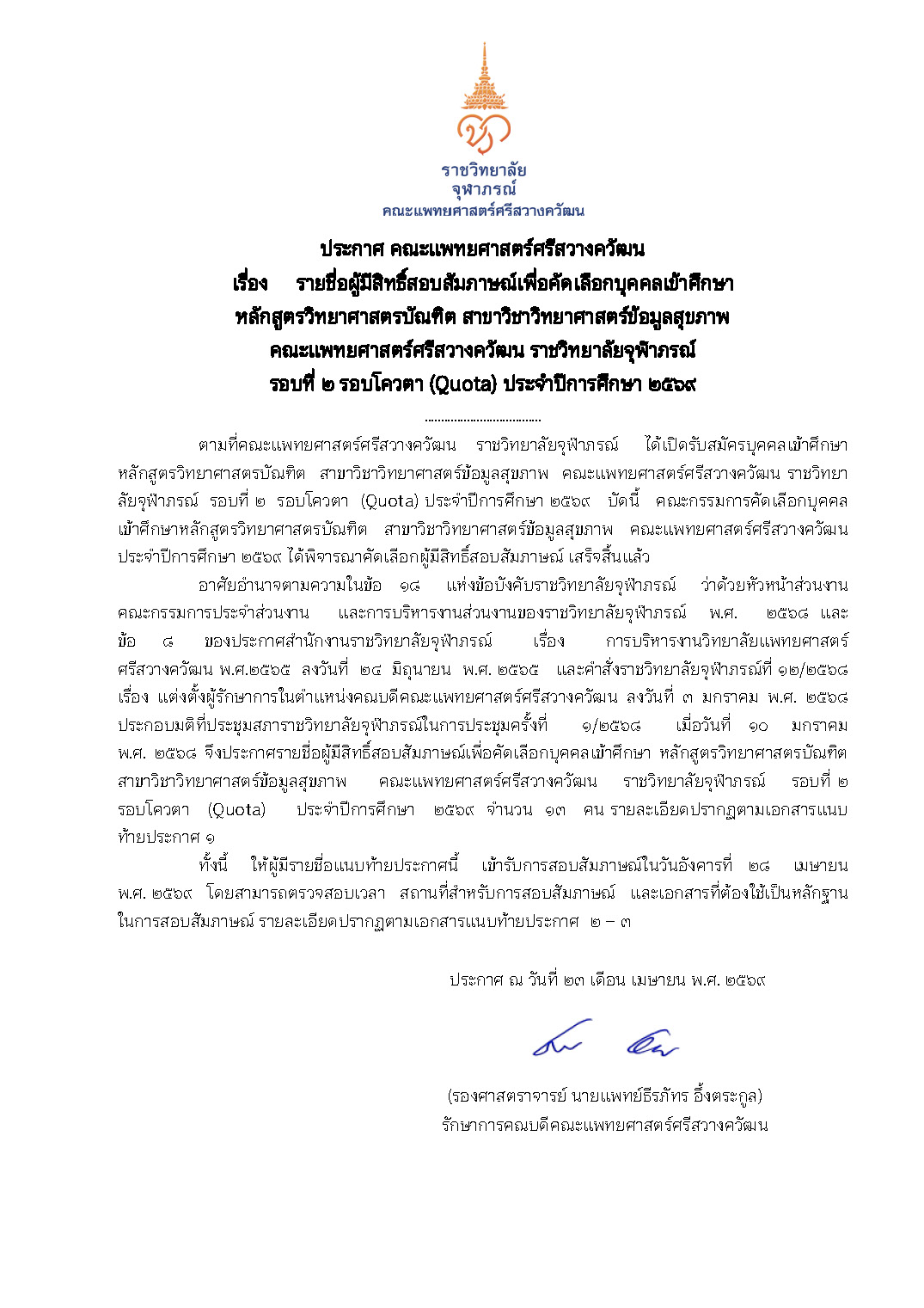 ประกาศ คณะแพทยศาสตร์ศรีสวางควัฒน เรื่อง รายชื่อผู้มีสิทธิ์สอบสัมภาษณ์เพื่อคัดเลือกบุคคลเข้าศึกษาหลักสูตรวิทยาศาสตรบัณฑิต สาขาวิชาวิทยาศาสตร์ข้อมูลสุขภาพ คณะแพทยศาสตร์ศรีสวางควัฒน ราชวิทยาลัยจุฬาภรณ์ รอบที่ 2 รอบโควตา (Quota) ประจำปีการศึกษา 2569 ประกาศวิทยาลัยแพทยศาสตร์ศรีสวางควัฒน เรื่อง รายชื่อผู้มีสิทธิ์สอบสัมภาษณ์เพื่อคัดเลือกบุคคลเข้าศึกษาหลักสูตรวิทยาศาสตรบัณฑิต สาขาวิชาวิทยาศาสตร์ข้อมูลสุขภาพ คณะแพทยศาสตร์ศรีสวางควัฒน ราชวิทยาลัยจุฬาภรณ์ รอบที่ 2 รอบโควตา (Quota) ประจำปีการศึกษา 2569 Download PDF Thitichaya Kunlai 2026-04-23T13:06:02+07:00