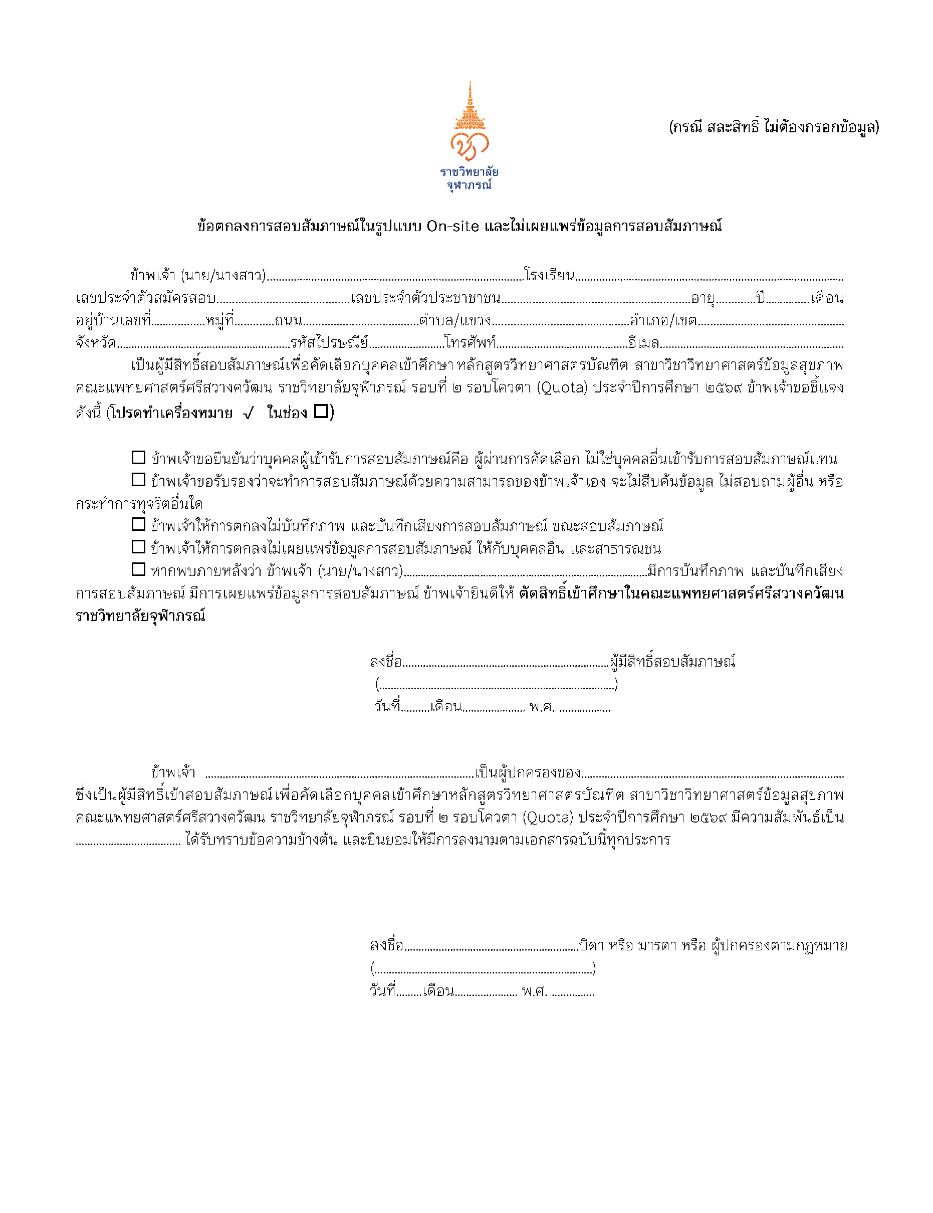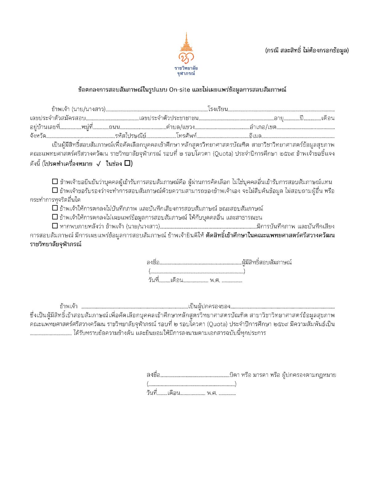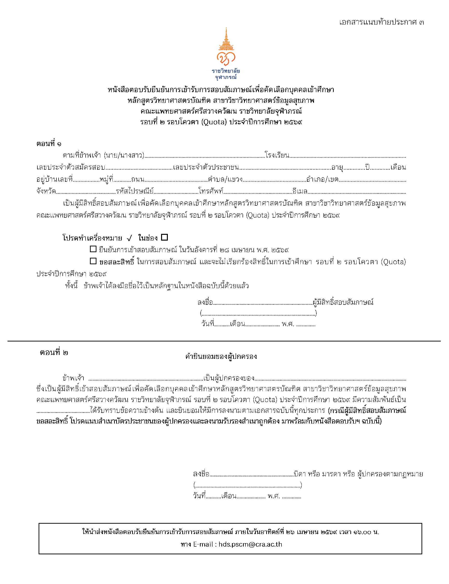 ประกาศ คณะแพทยศาสตร์ศรีสวางควัฒน เรื่อง รายชื่อผู้มีสิทธิ์สอบสัมภาษณ์เพื่อคัดเลือกบุคคลเข้าศึกษาหลักสูตรวิทยาศาสตรบัณฑิต สาขาวิชาวิทยาศาสตร์ข้อมูลสุขภาพ คณะแพทยศาสตร์ศรีสวางควัฒน ราชวิทยาลัยจุฬาภรณ์ รอบที่ 2 รอบโควตา (Quota) ประจำปีการศึกษา 2569 ประกาศวิทยาลัยแพทยศาสตร์ศรีสวางควัฒน เรื่อง รายชื่อผู้มีสิทธิ์สอบสัมภาษณ์เพื่อคัดเลือกบุคคลเข้าศึกษาหลักสูตรวิทยาศาสตรบัณฑิต สาขาวิชาวิทยาศาสตร์ข้อมูลสุขภาพ คณะแพทยศาสตร์ศรีสวางควัฒน ราชวิทยาลัยจุฬาภรณ์ รอบที่ 2 รอบโควตา (Quota) ประจำปีการศึกษา 2569 Download PDF Thitichaya Kunlai 2026-04-23T13:06:02+07:00