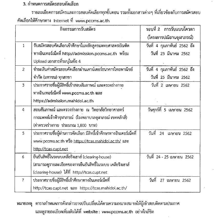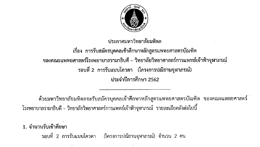ประกาศ การรับสมัครบุคคลเข้าศึกษาหลักสูตรแพทยศาสตรบัณฑิต ของคณะแพทยศาสตร์โรงพยาบาลรามาธิบดี – วิทยาลัยวิทยาศาสตร์การแพทย์เจ้าฟ้าจุฬาภรณ์ รอบที่ 2 การรับแบบโควตา (โครงการปณิธานจุฬาภรณ์) ประจำปีการศึกษา 2562